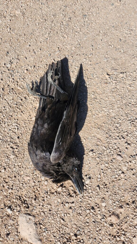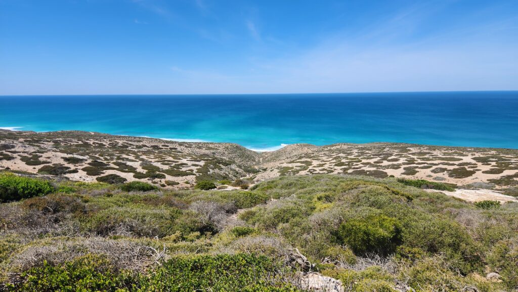 We left with a quick photo of a dead crow outside our cabin (probably heat exhaustion — nature’s brutal honesty), then hit the road. The plan split the day into two halves, with scenic rest stops in between. Google Maps, bless its heart, misled me about one of the Bunda Cliffs turnoffs (three kilometres off — hooray), so I trusted it and drove past a perfectly good lookout. Then, as the temperature shot north of 40°C, we abandoned the gravel turnoff for another lookout — no way we were wasting 40 minutes in that oven for yet another cliff photo. A short leg-stretch, an army of flies doing their best to join our picnic, and on to Nullarbor Roadhouse.